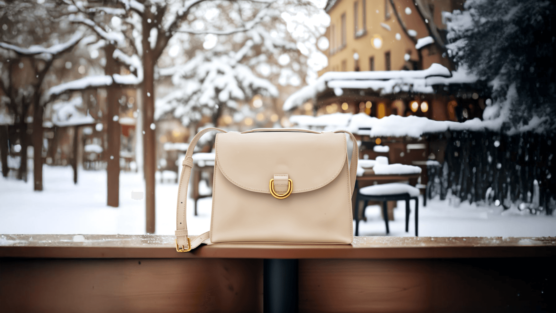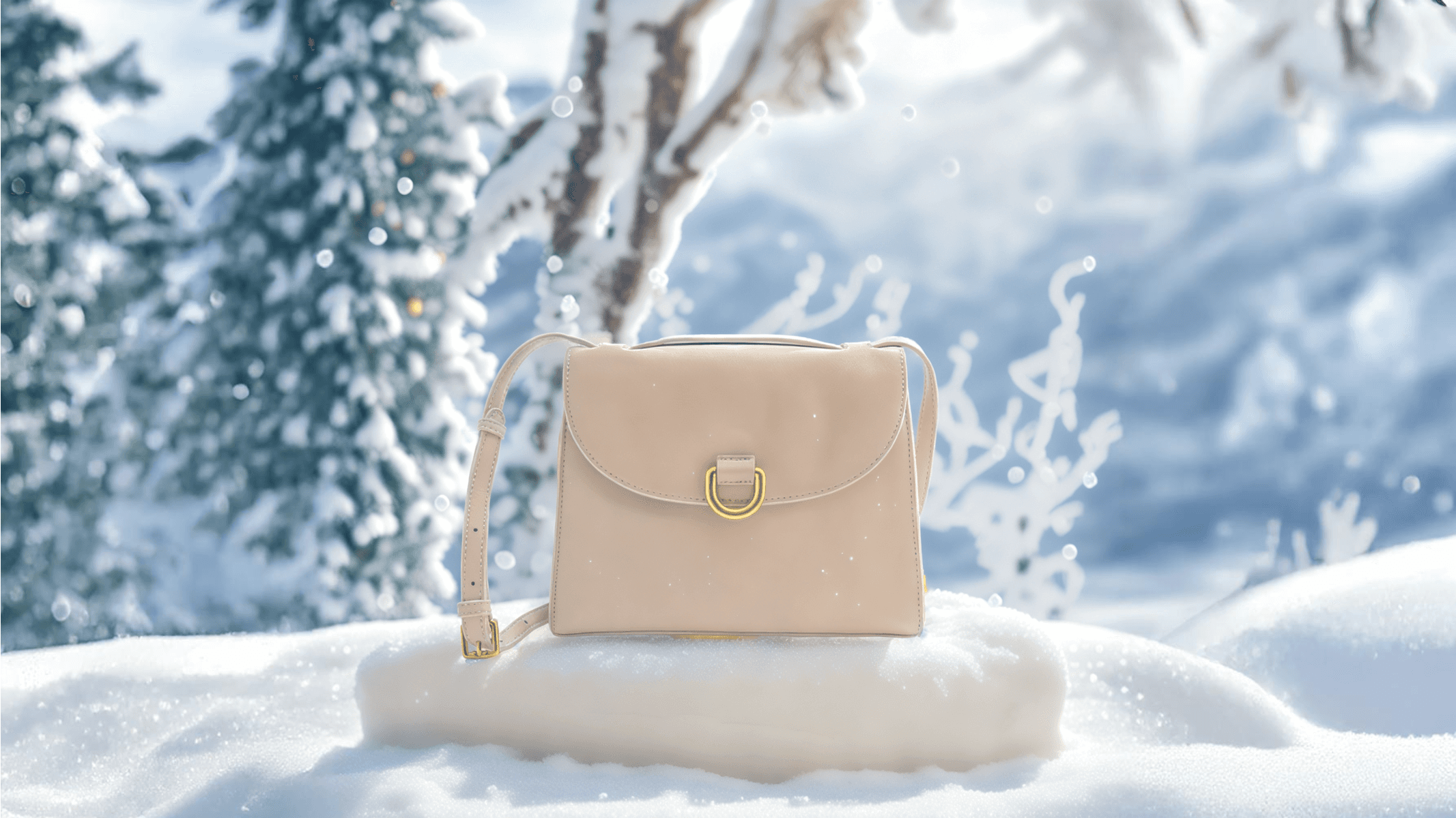 Luxury bags placed on a glittering and fantastic snowy mountain.