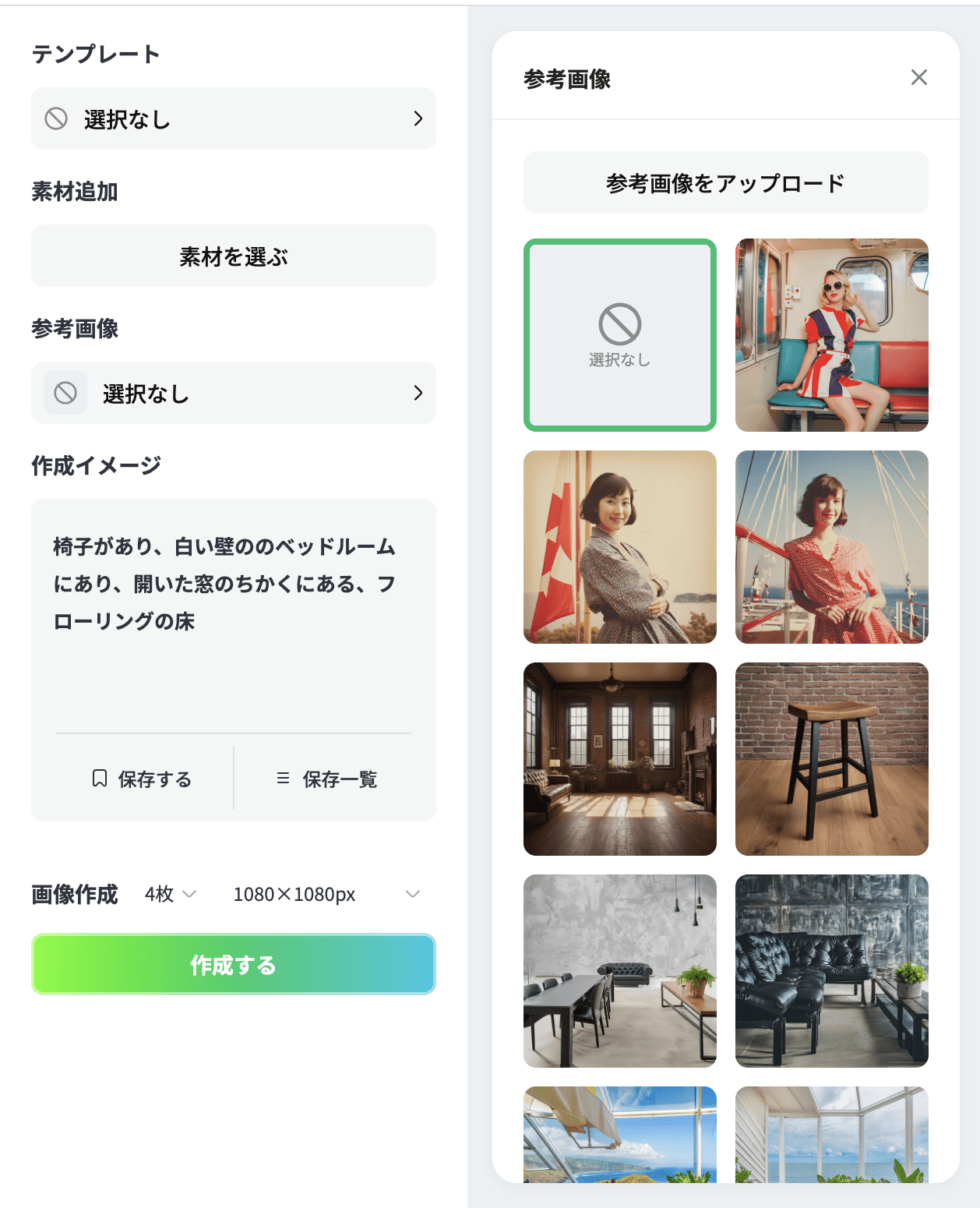 選択なしの部分をクリックすると、ご自身で使用したい参考画像のアップロードまたはFotographer.aiであらかじめ用意されたプリセットの画像を選択することができます。