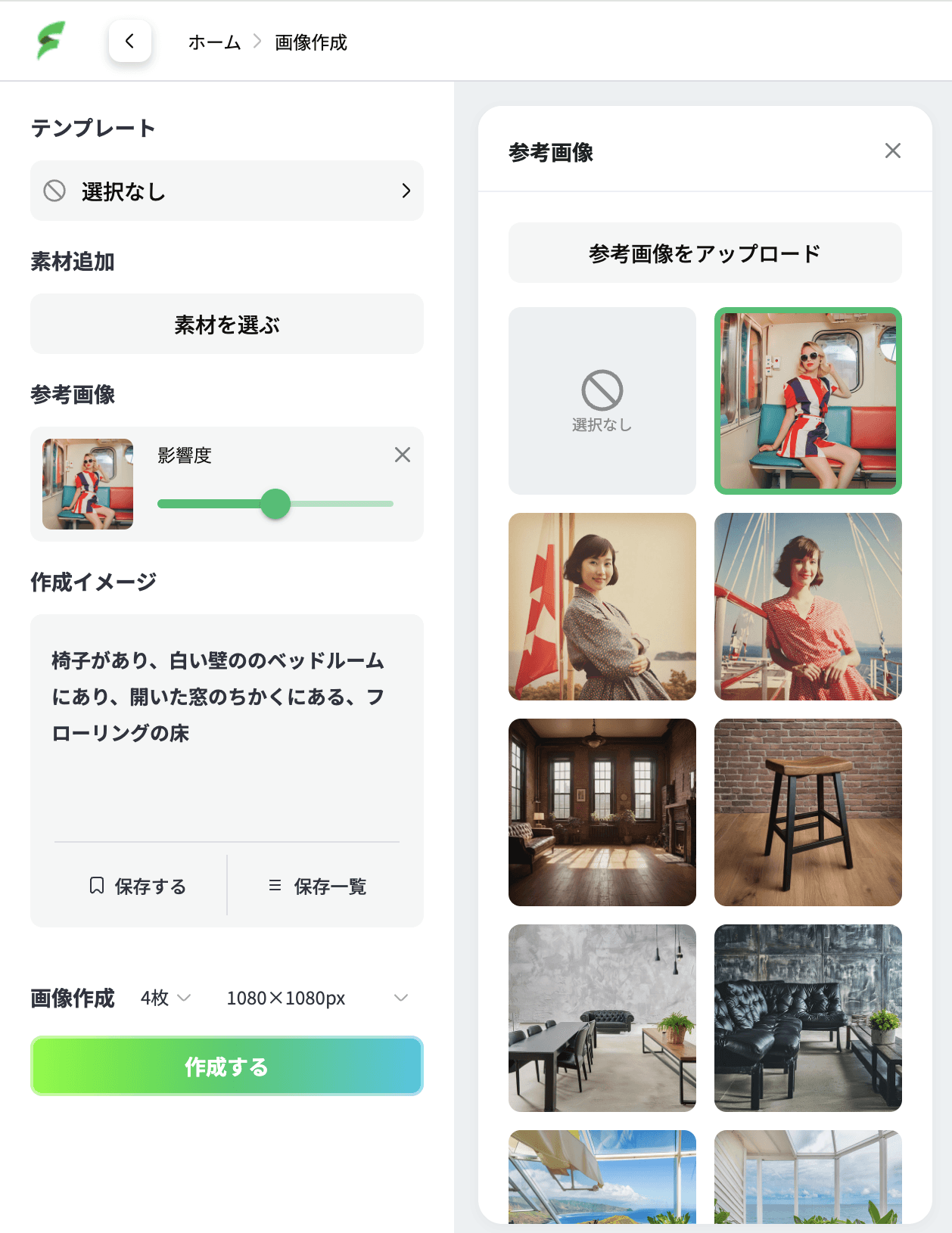 AIシーンまたはAIフォトのプロジェクトを開くと、左側に「参考画像」の欄があります。
