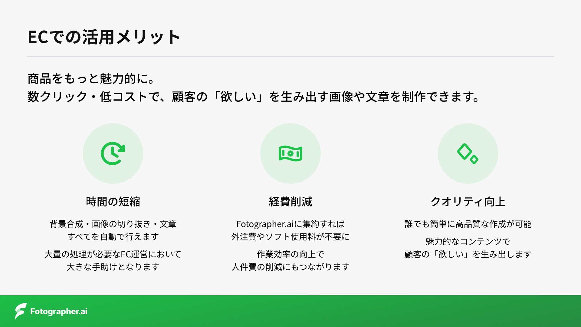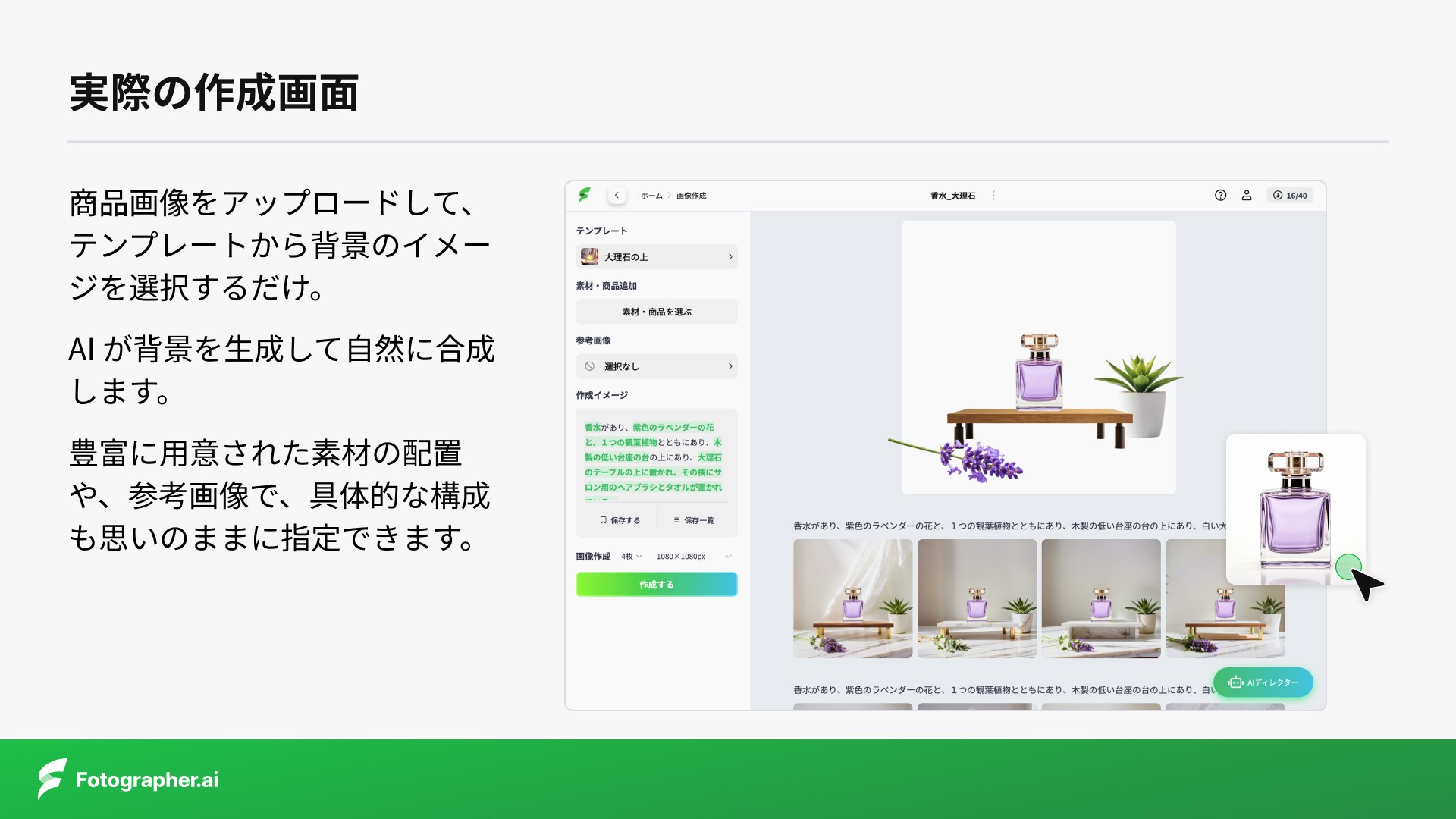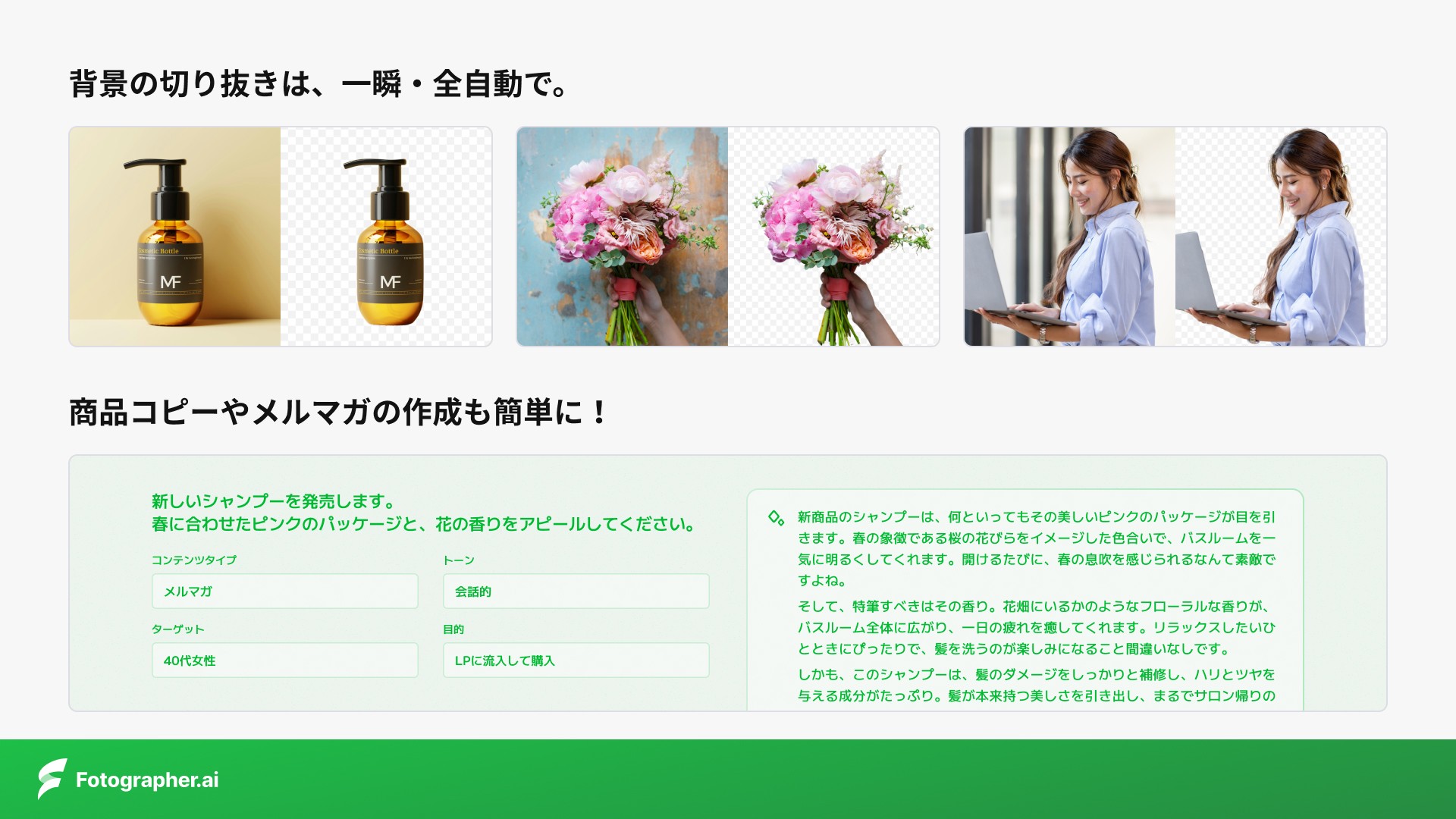 Fotographer AIは、EC事業者や広告クリエイティブの制作に携わる方向けに、商品画像やストックフォト、キャッチコピーやメルマガなどを自動生成できる生成AIサービス「Fotographer.ai」を提供しています。